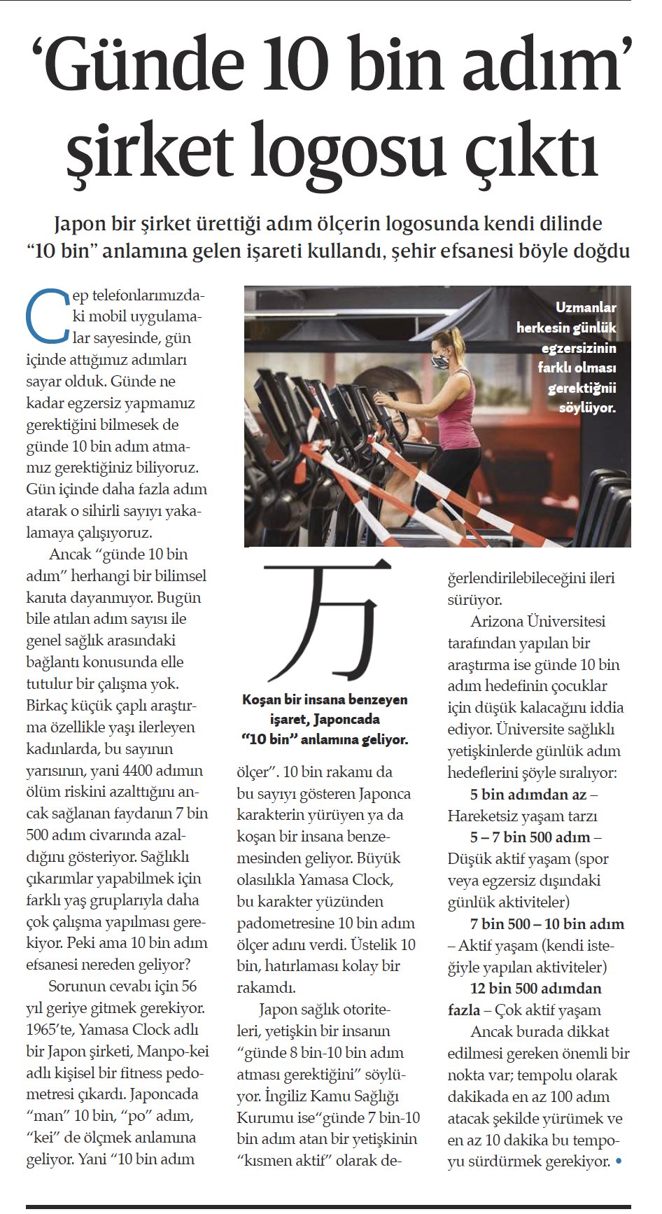 “Sorunun cevabı için 56 yıl geriye gitmek gerekiyor. 1965’te, Yamasa Clock adlı bir Japon şirketi, Manpo-kei adlı kişisel bir fitness pedometresi çıkardı. Japoncada “man” 10 bin, “po” adım, “kei” de ölçmek anlamına geliyor. Yani “10 bin adım ölçer”. 10 bin rakamı da bu sayıyı gösteren Japonca karakterin yürüyen ya da koşan bir insana benzemesinden geliyor. Büyük olasılıkla Yamasa Clock, bu karakter yüzünden padometresine 10 bin adım ölçer adını verdi. Üstelik 10 bin, hatırlaması kolay bir rakamdı. Japon sağlık otoriteleri, yetişkin bir insanın “günde 8 bin-10 bin adım atması gerektiğini” söylüyor.”