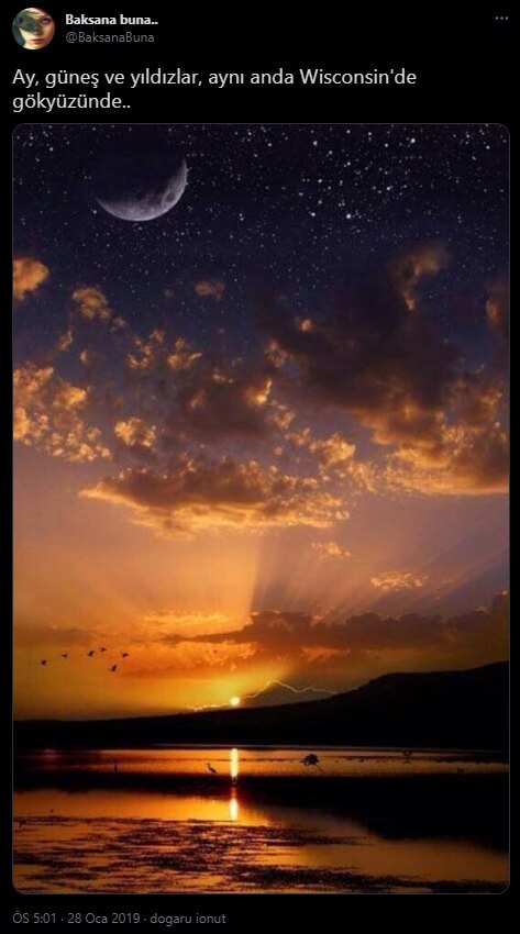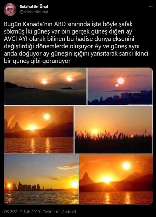 “Bugün Kanada’nın ABD sınırında işte böyle şafak sökmüş. İki güneş var biri gerçek güneş diğeri ay AVCI AYI olarak bilinen bu hadise dünya eksenini değiştirdiği dönemlerde oluşuyor Ay ve güneş aynı anda doğuyor ay güneşin ışığını yansıtarak sanki ikinci bir güneş gibi görünüyor.”