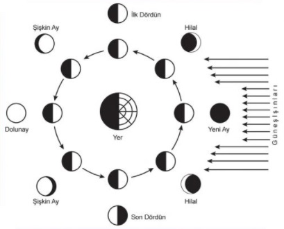 - Ay’ın dünya etrafında dönmesi sonucu Ay’ın evreleri oluşur. Yeni ay, ilk dördün, dolunay ve son dördün Ay’ın evreleridir.