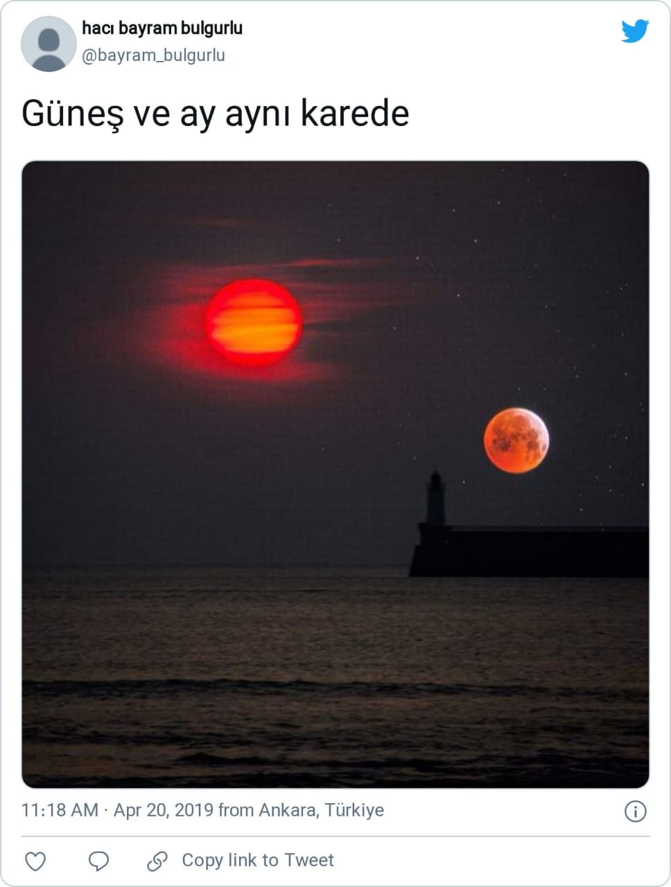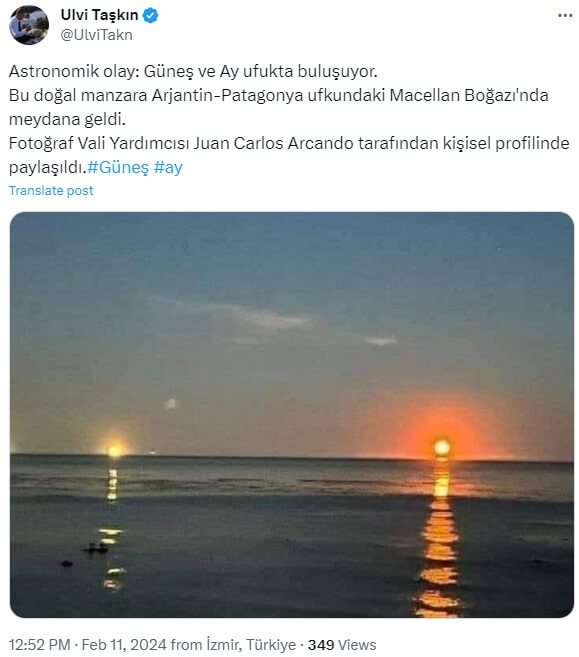 Ulvi Taşkın (@UlviTakn): “Astronomik olay: Güneş ve Ay ufukta buluşuyor. Bu doğal manzara Arjantin-Patagonya ufkundaki Macellan Boğazı’nda meydana geldi. Fotoğraf Vali Yardımcısı Juan Carlos Arcando tarafından kişisel profilinde paylaşıldı.#Güneş #ay”
