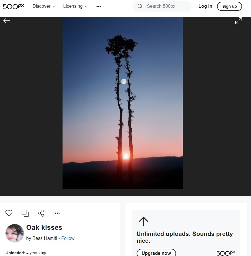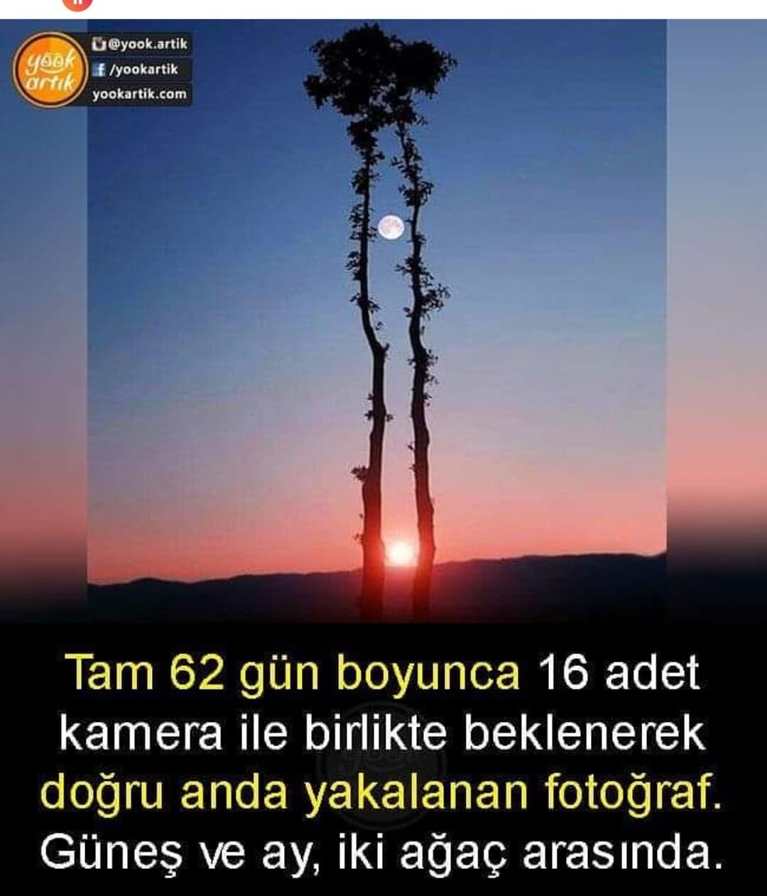 “Tam 62 gün boyunca 16 adet kamera ile birlikte beklenerek doğru anda yakalanan fotoğraf. Güneş ve ay, iki ağaç arasında.”
