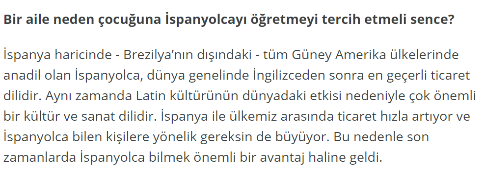 İspanya haricinde – Brezilya’nın dışındaki – tüm Güney Amerika ülkelerinde anadil olan İspanyolca, dünya genelinde İngilizceden sonra en geçerli ticaret dilidir. Aynı zamanda Latin kültürünün dünyadaki etkisi nedeniyle çok önemli bir kültür ve sanat dilidir. İspanya ile ülkemiz arasında ticaret hızla artıyor ve İspanyolca bilen kişilere yönelik gereksin de büyüyor. Bu nedenle son zamanlarda İspanyolca bilmek önemli bir avantaj haline geldi.