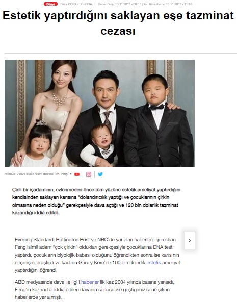 Evening Standard, Huffington Post ve NBC’de yar alan haberlere göre Jian Feng isimli adam “çok çirkin” oldukları gerekçesiyle çocuklarına DNA testi yaptırdı, çocukların biyolojik babası olduğunu öğrendikten sonra ise karısının geçmişini araştırdı ve kadının Güney Kore’de 100 bin dolarlık estetik ameliyat yaptırdığını öğrendi. ABD medyasında dava ile ilgili haberler ilk kez 2004 yılında basına yansıdı. Feng’in kazandığı iddia edilen davanın sonucu ise geçtiğimiz sene çıkan haberlerde yer almıştı.