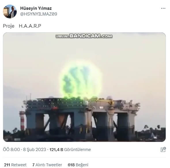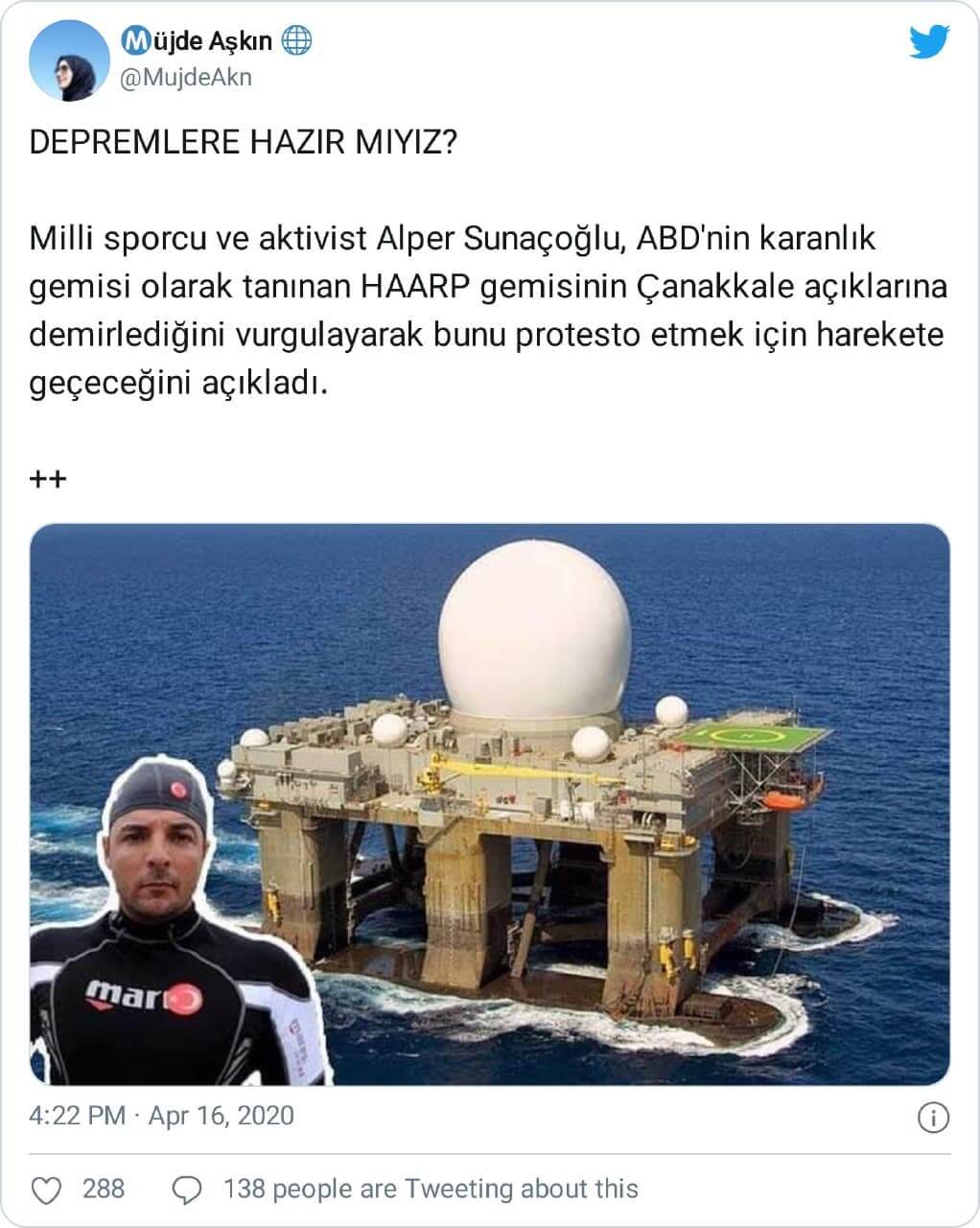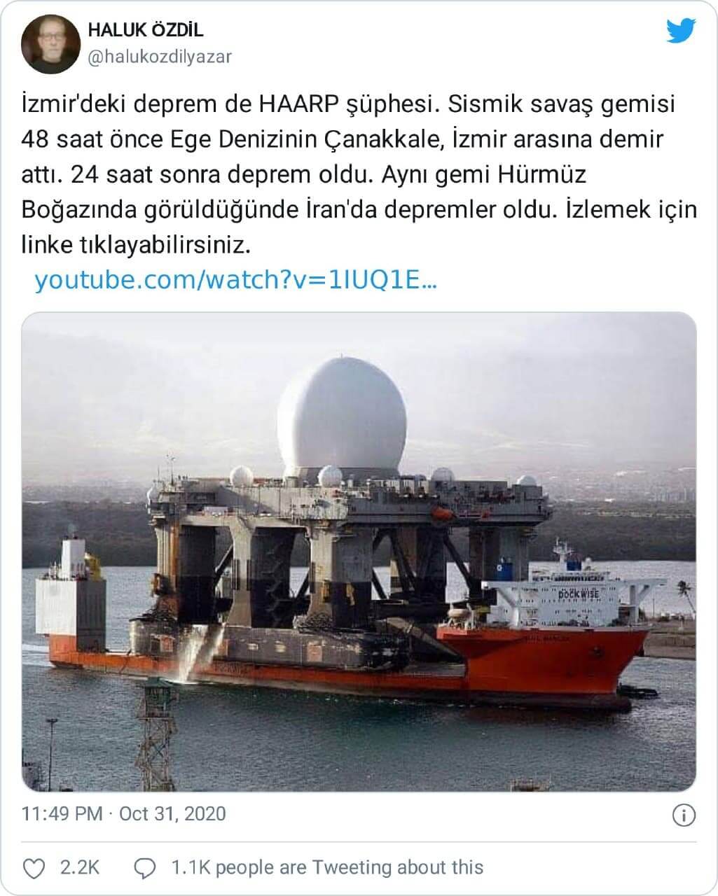 “İzmir’deki deprem de HAARP şüphesi. Sismik savaş gemisi 48 saat önce Ege Denizinin Çanakkale, İzmir arasına demir attı. 24 saat sonra deprem oldu. Aynı gemi Hürmüz Boğazında görüldüğünde İran’da depremler oldu.”
