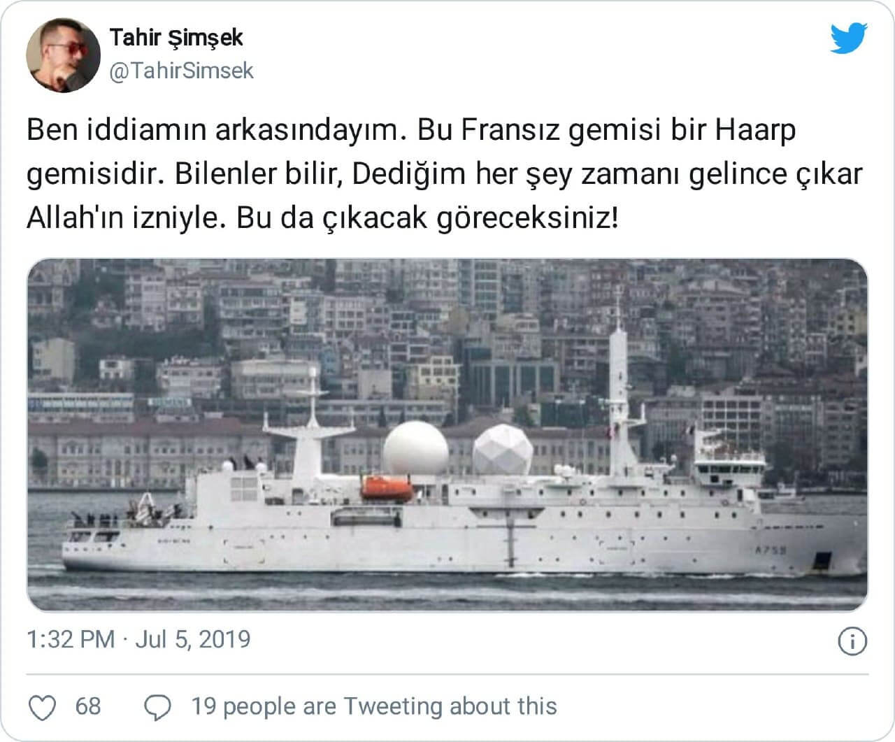 “Ben iddiamın arkasındayım. Bu Fransız gemisi bir Haarp gemisidir. Bilenler bilir, Dediğim her şey zamanı gelince çıkar Allah’ın izniyle. Bu da çıkacak göreceksiniz!”