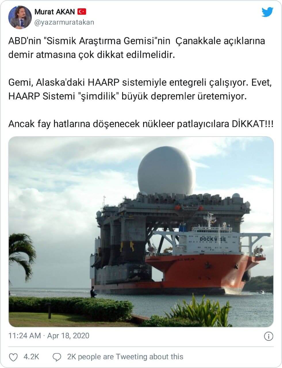 İzmir Depremi öncesinde 16 Nisan 2020 tarihinde boğazdan dev bir petrol arama gemisinin geçtiği belirtilmişti. Görünen o ki, petrol arama platformları ya da radar gemileri HAARP gemisi olarak nitelenip meydana gelen depremlerle ilişkilendirilmiş.