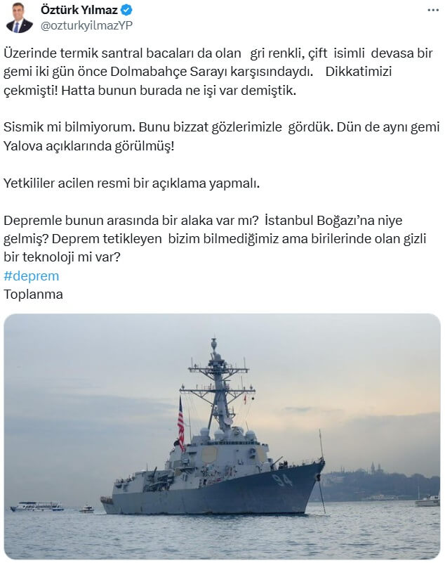 Öztürk Yılmaz (@ozturkyilmazYP): “Üzerinde termik santral bacaları da olan gri renkli, çift isimli devasa bir gemi iki gün önce Dolmabahçe Sarayı karşısındaydı. Dikkatimizi çekmişti! Hatta bunun burada ne işi var demiştik. Sismik mi bilmiyorum. Bunu bizzat gözlerimizle gördük. Dün de aynı gemi Yalova açıklarında görülmüş! Yetkililer acilen resmi bir açıklama yapmalı. Depremle bunun arasında bir alaka var mı? İstanbul Boğazı’na niye gelmiş? Deprem tetikleyen bizim bilmediğimiz ama birilerinde olan gizli bir teknoloji mi var? #deprem Toplanma”