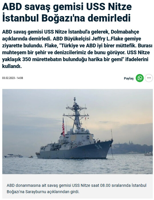 ABD donanmasına ait USS Nitze’nin (DDG 94) 2023 yılı Şubat ayında Dolmabahçe’ye demirlediği andan fotoğraf kullanılmış.