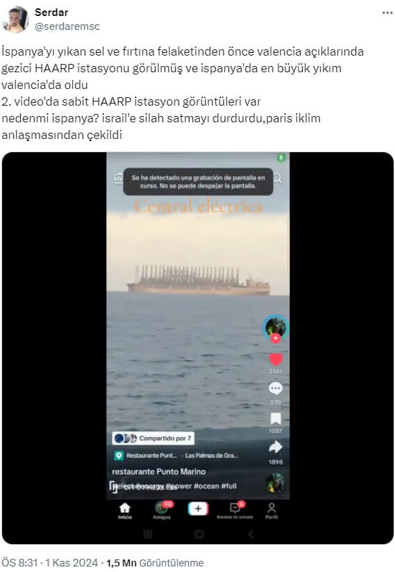 İspanya’da yaşanan sel felaketinden önce Valencia açıklarında gezici HAARP istasyonu görüldüğü iddiasıyla Valencia’dan yaklaşık 1900 km uzaklıktaki İspanya’nın Kanarya Adaları Özerk Bölgesi’ndeki Las Palmas de Gran Canaria açıklarındaki Karadeniz Powership’e ait yüzer enerji santralinin görüntülendiği video kullanılmış.