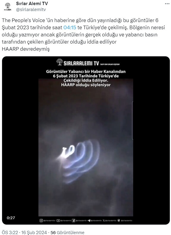 Sırlar Alemi TV (@sirlaralemitv): “The People’s Voice ‘ün haberine göre dün yayınladığı bu görüntüler 6 Şubat 2023 tarihinde saat 04:15 te Türkiye’de çekilmiş. Bölgenin neresi olduğu yazmıyor ancak görüntülerin gerçek olduğu ve yabancı basın tarafından çekilen görüntüler olduğu iddia ediliyor HAARP devredeymiş”