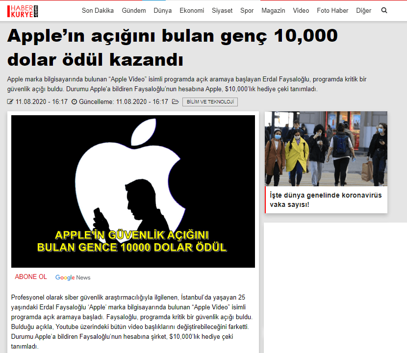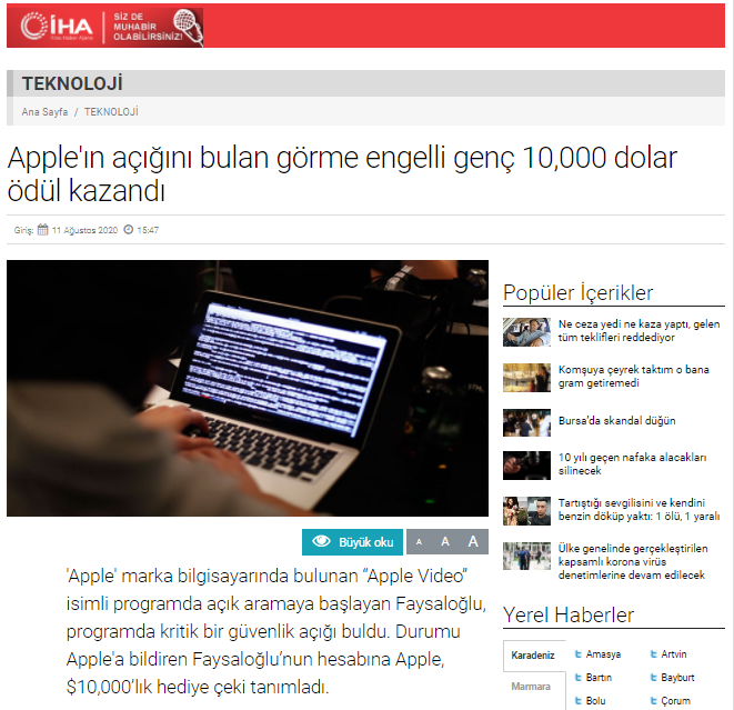 Görme engelli bir gencin gerçekte var olmayan “Apple Video” isimli bir uygulamada güvenlik açığını bulduğu, bu açık ile Youtube üzerindeki bütün video başlıklarını değiştirebileceğini fark ettiği, bu durumu Apple’a ve Microsoft’a bildiren gencin 10 bin dolarlık hediye çeki aldığı, güvenlik açığını bulan görme engelli kişinin Kadıköy’deki bir internet kafede arkadaşları ile güvenlik açığı hakkında çalışmalar yaptığı gibi birbirinden alakasız absürt ifadelerin geçtiği asparagas da haber sitelerince ciddiye alınmıştı.