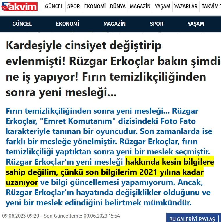 Takvim gazetesi Rüzgar Erkoçlar hakkında ChatGPT’nin ürettiği metni kullanırken “… hakkında kesin bilgilere sahip değilim, çünkü son bilgilerim 2021 yılına kadar uzanıyor ve bilgi güncellemesi yapamıyorum. …” kısmını gözden kaçırmıştı.