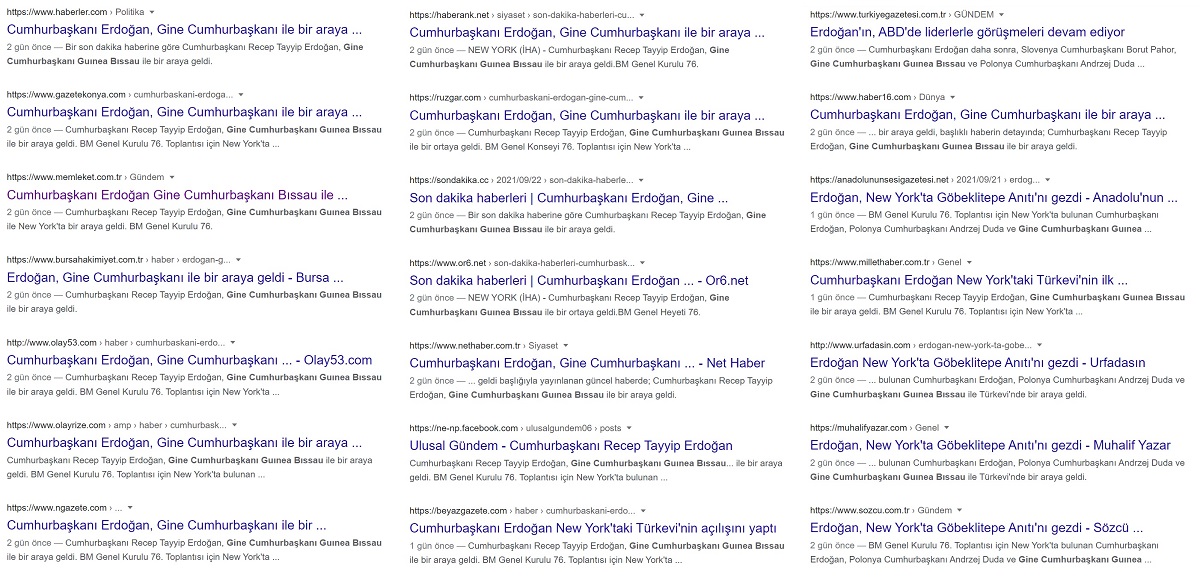 Cumhurbaşkanı Erdoğan’ın Birleşmiş Milletler Genel Kurulu için bulunduğu New York’ta 22 Eylül 2021 günü görüştüğü Gine Bissau Cumhurbaşkanı Umaro Sissoco Embalo, haber sitelerinde (KOPYALA YAPIŞTIR metin kontrol edilmeden) “Gine Cumhurbaşkanı Guinea Bissau” olarak aktarılmıştı.