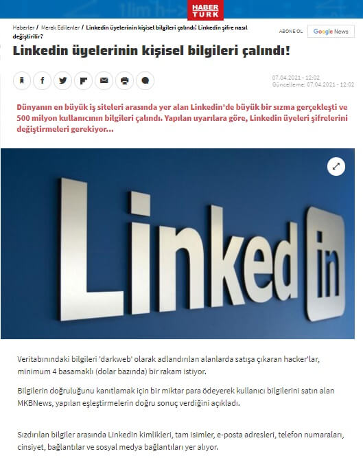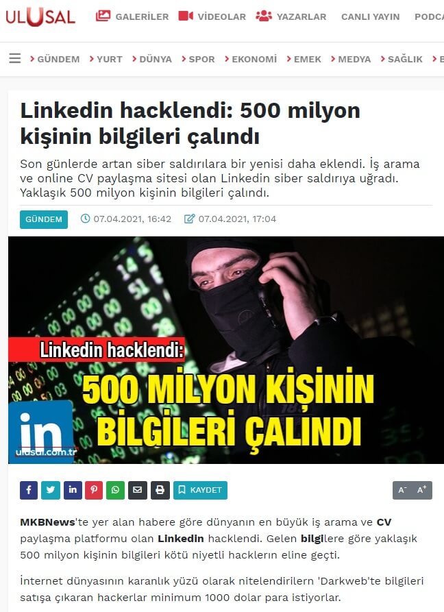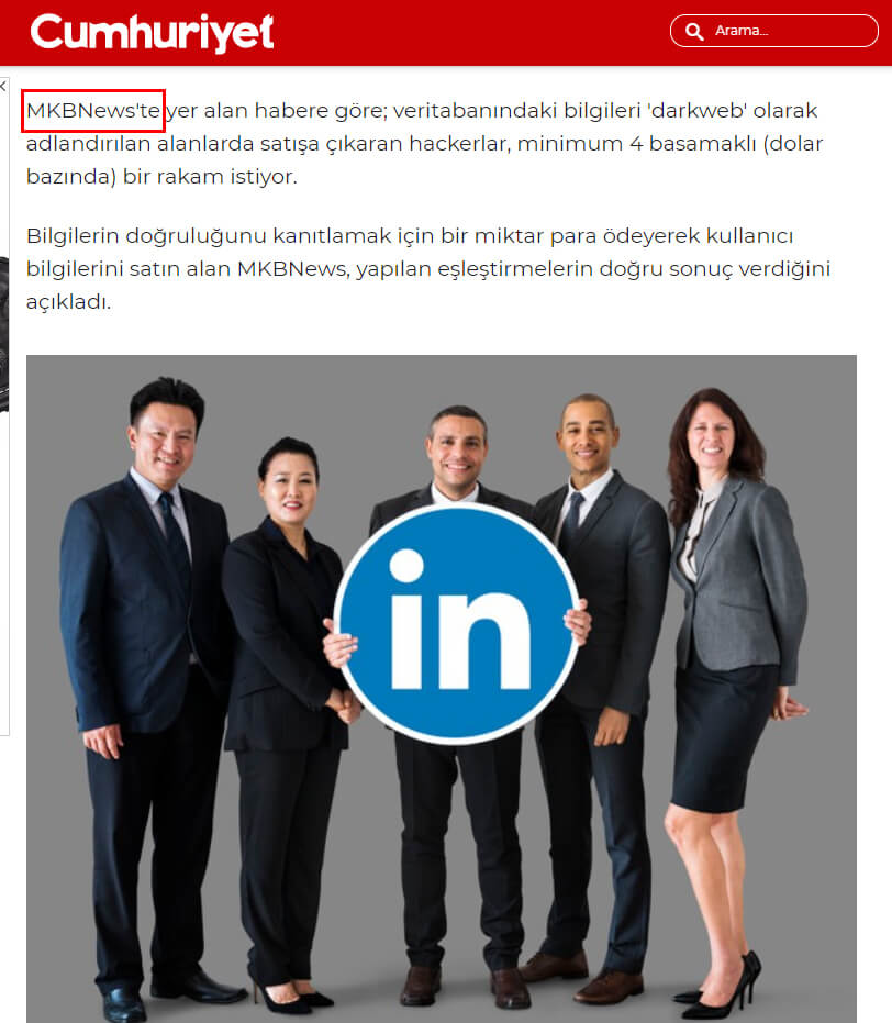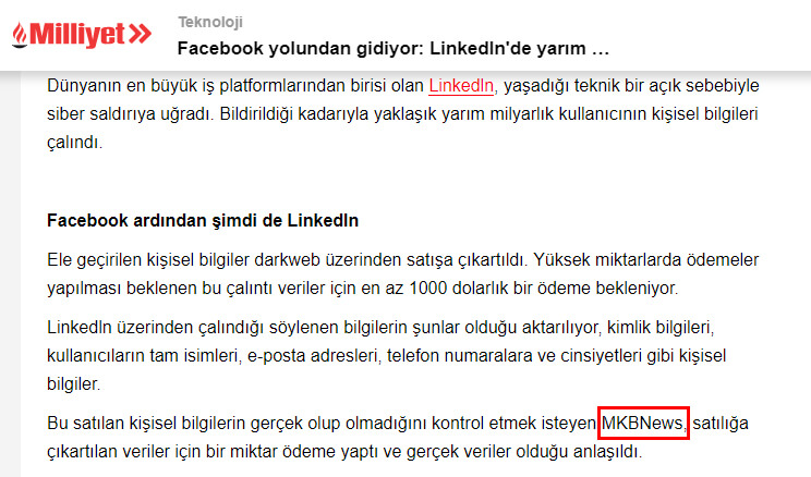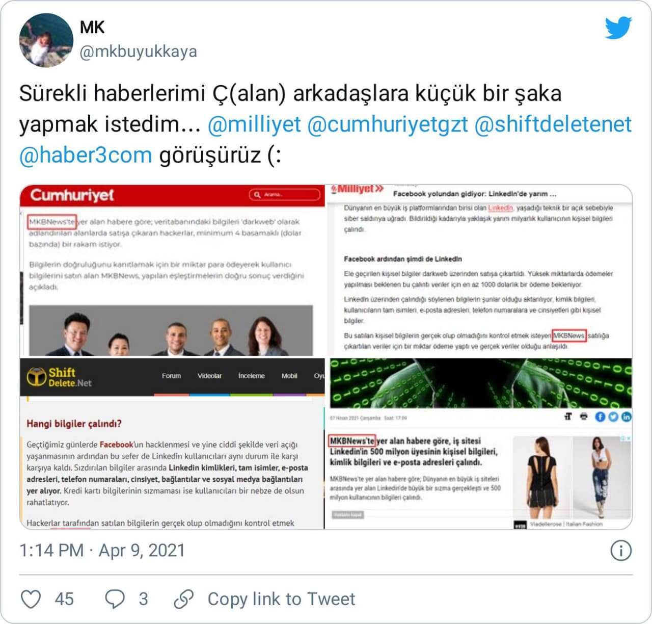 TV100.com Genel Yayın Yönetmeni Mustafa Kemal Büyükkaya, haber sitelerinin teyit etmeden, kaynağını incelemeden diğer sitelerdeki haberleri (herhangi bir atıf yapmadan) kullandıklarını ifşa etmek için kendi isminin baş haflerinden oluşan “MKBNews” şeklinde bir kaynak uydurarak LinkedIn’de 500 milyon kullanıcının bilgilerinin çalındığı iddiasını içeren haberi yayımlamıştı.