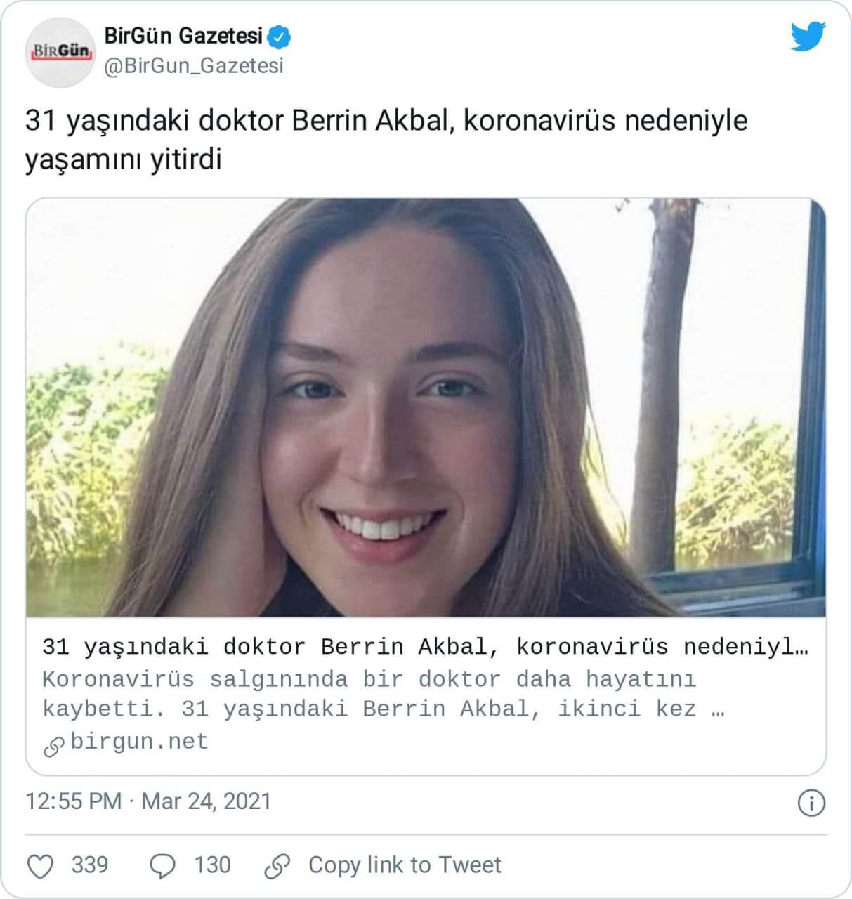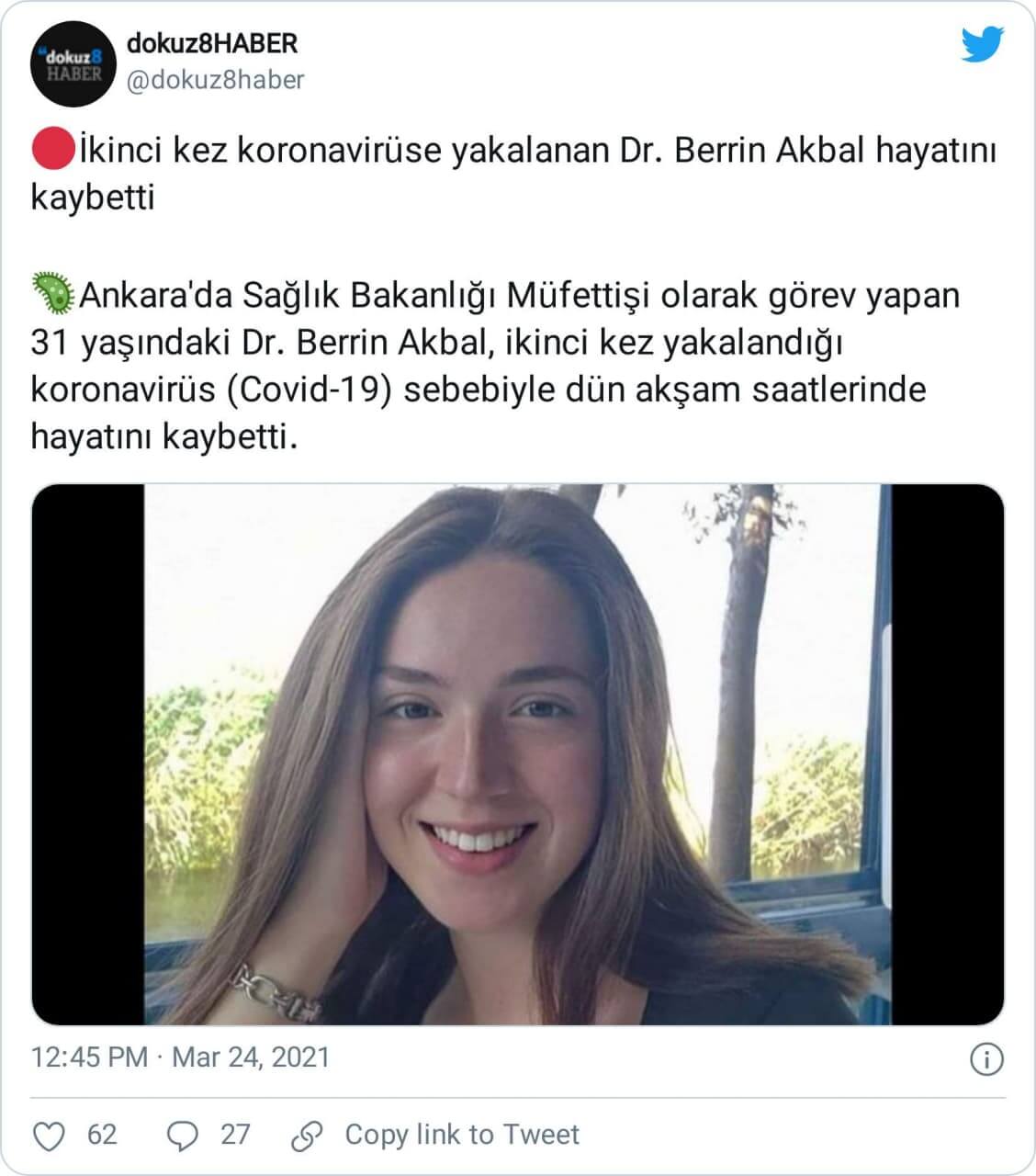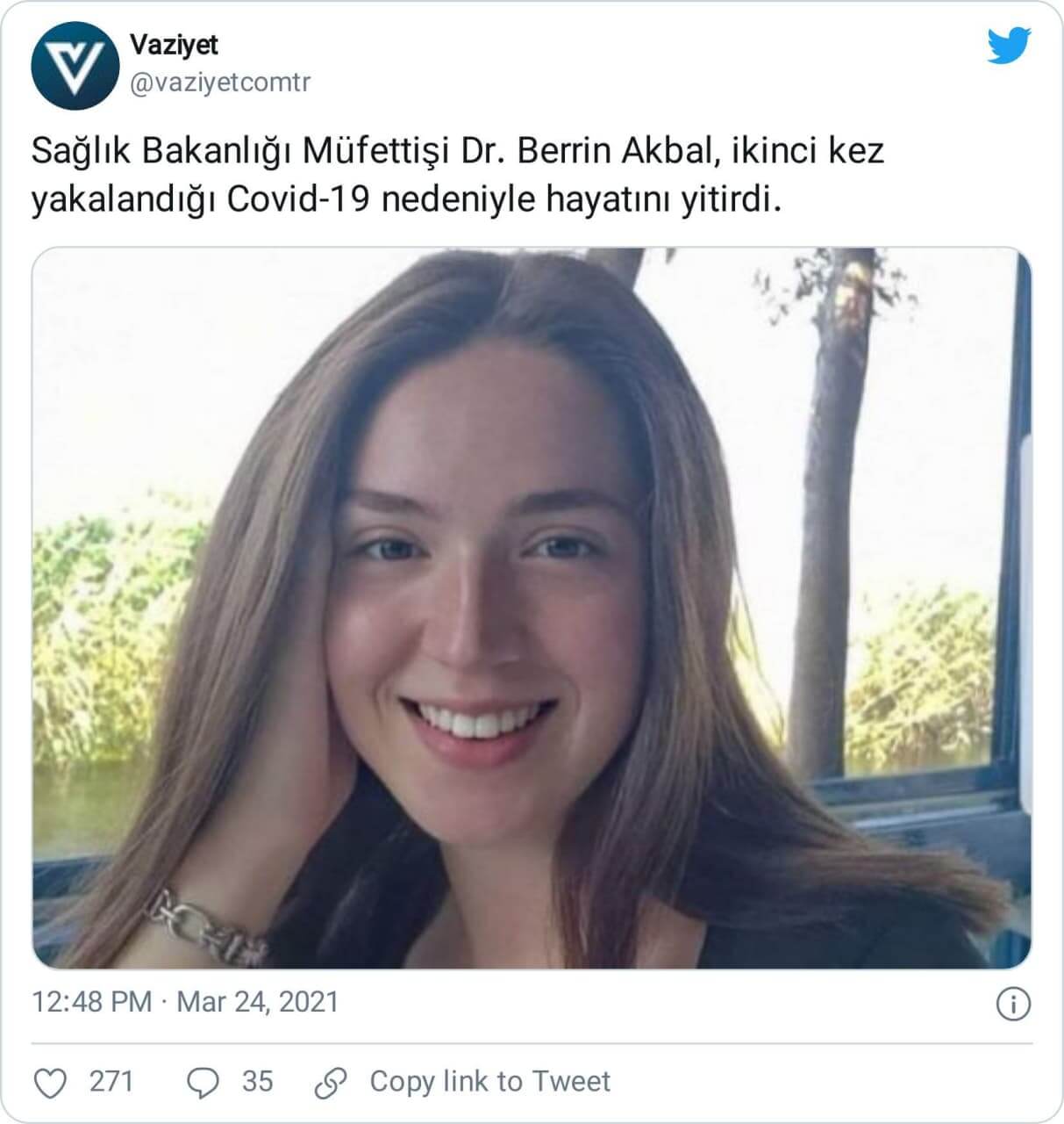 Halbuki, kaynak olarak saglikpersonelihaber.org adlı internet sitesi gösterilen haber asılsızdı. Genç yaşta bir sağlık müfettişinin ikinci kez yakalandığı koronavirüs salgını nedeniyle vefat ettiği haberi asparagastı… Haberde kullanılan fotoğraf, koronavirüs nedeniyle hayatını kaybeden Sağlık Bakanlığı Müfettişi 31 yaşındaki Doktor Berrin Akbal’a değil, (Müjdat Gezen Tiyatrosu’ndan) Berfu Çetinkaya’ya aitti.