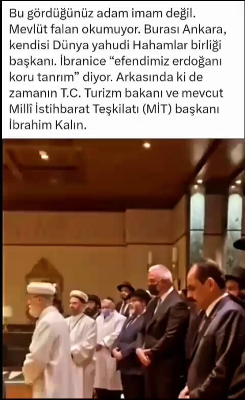 Bu gördüğünüz adam imam değil. Mevlüt falan okumuyor. Burası Ankara, kendisi Dünya yahudi Hahamlar birliği başkanı. İbranice “efendimiz Erdoğan’ı koru tanrım” diyor. Arkasında ki de Turizm bakanı ve mevcut Millî İstihbarat Teşkilatı (MİT) başkanı İbrahim Kalın. pic.twitter.com/EmnPYswNsZ