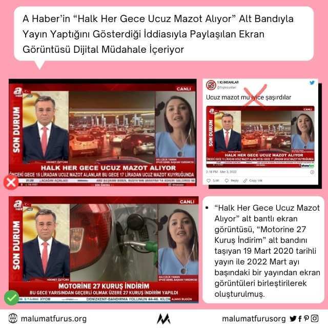 A Haber’in “Halk Her Gece Ucuz Mazot Alıyor” alt bandıyla yayın yaptığı yönünde paylaşılan ekran görüntüsü, “Motorine 27 Kuruş İndirim” alt bandını taşıyan 19 Mart 2020 tarihli yayından ekran görüntüsü ile 2022 Mart ayı başından bir ekran görüntüsü birleştirilerek oluşturulmuş.