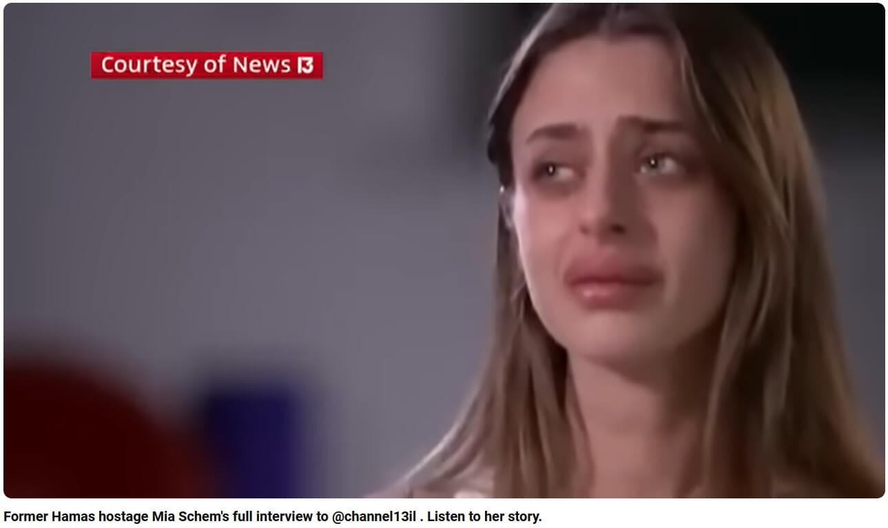 Röportajın İbranice’den tercüme edilen altyazılarını içeren kayıtlar incelendiğinde Mia Schem’in ağladığı anda serbest bırakıldığında Hamas’ın elinde geride kalan İsrailli esirler hakkında konuştuğu görülüyor.