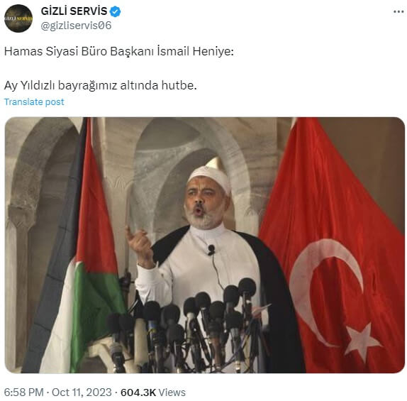 Gizli Servis (@gizliservis06): “Hamas Siyasi Büro Başkanı İsmail Heniye: Ay Yıldızlı bayrağımız altında hutbe.”