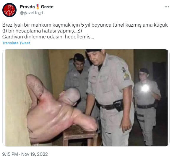 PravdaGaste (@gazetta_rf): “Brezilyalı bir mahkum kaçmak için 5 yıl boyunca tünel kazmış ama küçük (!) bir hesaplama hatası yapmış…:)) Gardiyan dinlenme odasını hedeflemiş…”