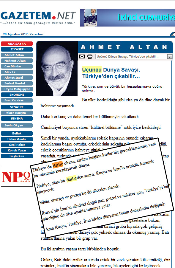 Kurtul Altuğ, farkında olmadan Ahmet Altan’ın 2007 yılında önce Le Monde gazetesinde, ardından Alman Stern dergisinde yayınlanan “Üçüncü Dünya Savaşı, Türkiye’den çıkabilir…” başlıklı yazısına atıf yapmış olmuş.