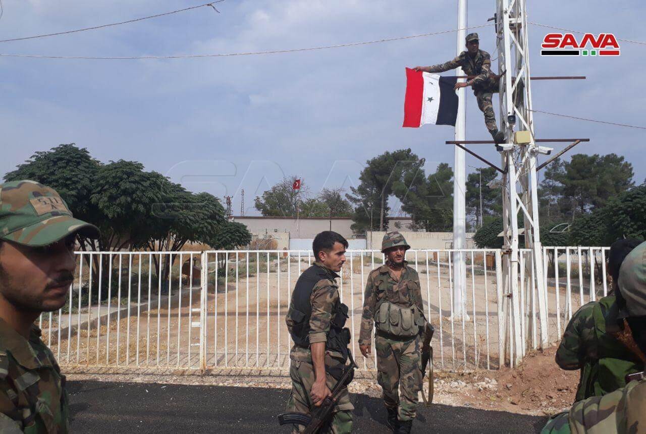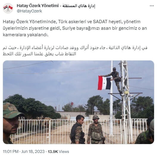 Hatay’ın bölündüğü ve Türk askerinin gözü önünde Suriye bayrağı asıldığı iddiasıyla servis edilen görsel de Hatay’dan değil. “Hatay Özerk Yönetiminde, Türk askerleri ve SADAT heyeti, yönetim üyelerimizin ziyaretine geldi, Suriye bayrağımızı asan bir gencimiz o an kameralara yakalandı.” ifadeleriyle paylaşılan fotoğrafta Suriye ordusu askerleri 2019 yılında (7 yılın ardından) Ayn el-Arab’da (Kobani) Suriye bayrağını asarken görüntülenmiş (Fotoğrafta -logosu temizlenmiş olsa da- Suriye devlet resmi haber ajansı SANA’nın filigranı görülebiliyor).