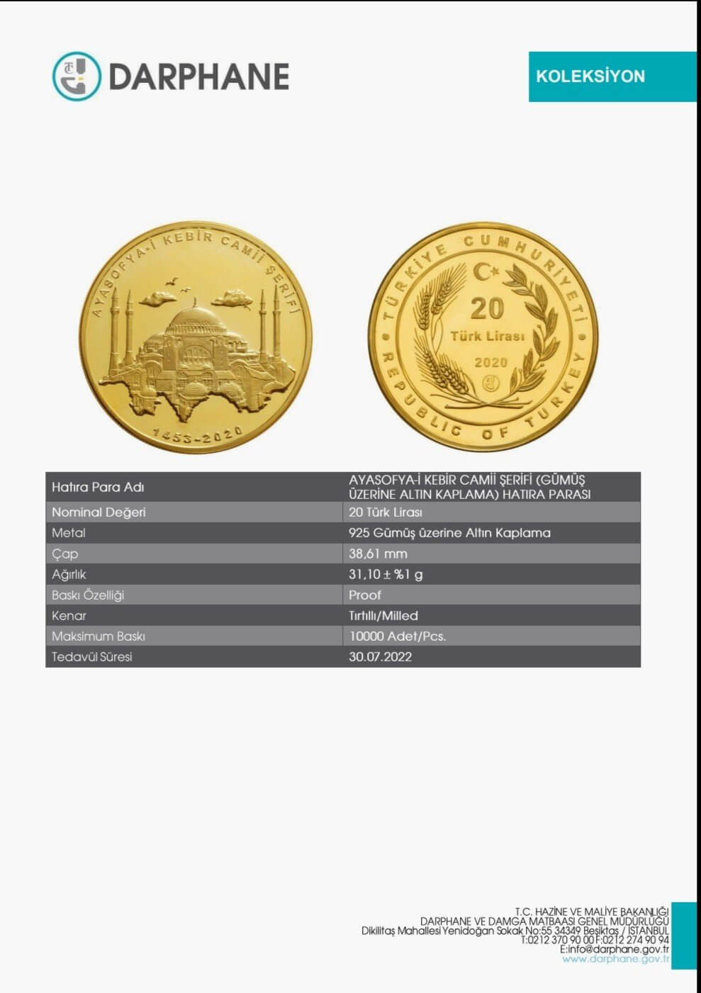 Darphane’nin resmi sayfasında yayımlanan bilgide Ayasofya Camii hatıra parasının teknik özelliklerine ulaşılabiliyor.