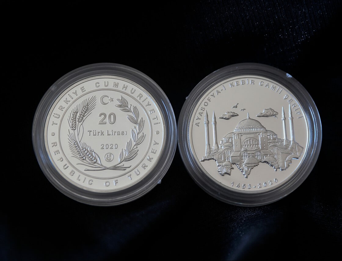 Ayasofya Camii’nin ibadete açılışı anısına görseldeki 20 lira değerindeki madenî para, hatıra parası olarak 2020 yılında basılmıştı.