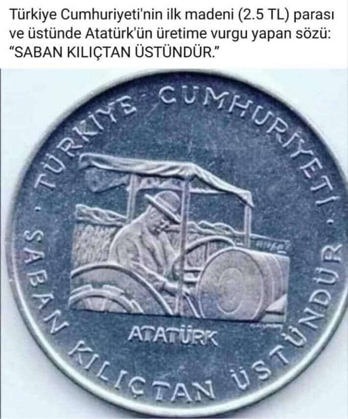 Türkiye Cumhuriyeti’nin ilk madeni parasının üzerinde “saban kılıçtan üstündür” yazdığı ileri sürülmüştü. Ancak, iddia edilenin aksine paylaşılan görsel Türkiye Cumhuriyeti’nin ilk madeni parasına değil; 1970-1979 yılları arasında çıkarılan bir hatıra paraya aitti. Ayrıca, paylaşılan hatıra parası öncesinde çıkarılan madeni ufaklık paralar mevcuttu (Detay için, üzerinde ‘saban kılıçtan üstündür’ yazılı madenî hatıra paralar hakkındaki yazımıza göz atabilirsiniz).