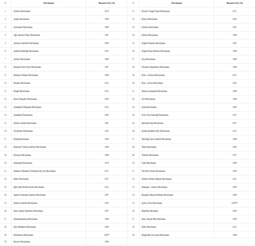 | # | Havalimanı | Hizmete Giriş Yılı |