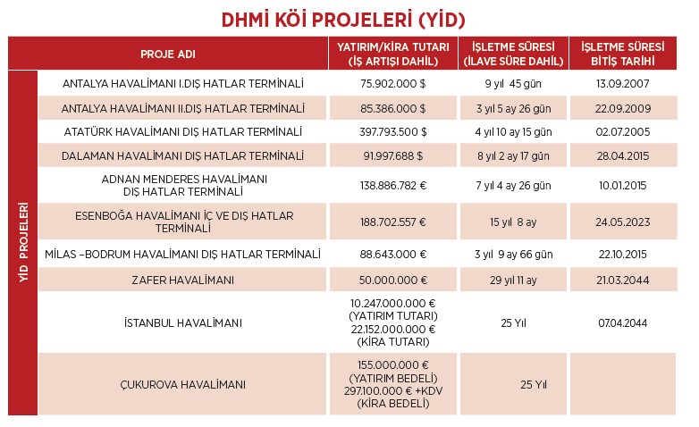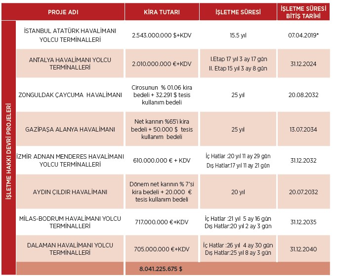 Devlet Hava Meydanları İşletmesi Genel Müdürlüğü internet sitelerinde yayımlanan faaliyet raporlarında yer verilen ap-İşlet-Devret ve Yap-Kirala-Devret modelleri ile yapılan havalimanları şöyle sıralanıyor: