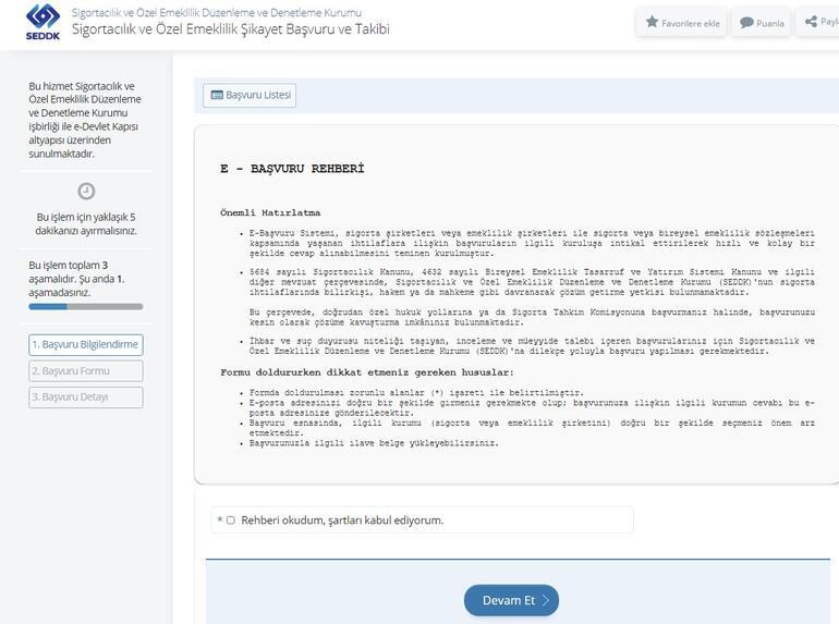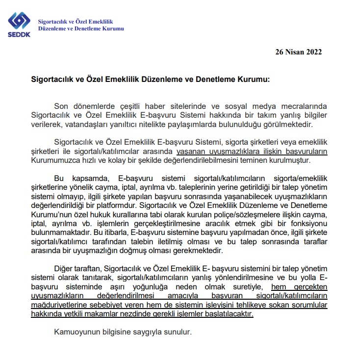 Sigortacılık ve Özel Emeklilik Düzenleme ve Denetleme Kurumu (SEDDK) tarafından yapılan açıklamada e-başvuru sisteminde böyle bir özelliğin olmadığı belirtilmişti.