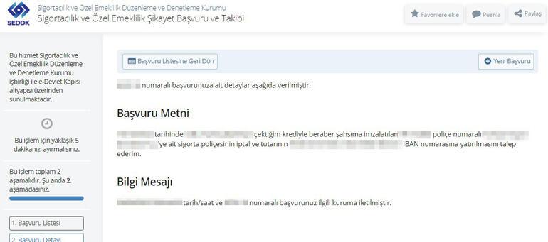 E-devlet üzerinden bir işlem daha yapılıyor; o da, ‘Sigortacılık ve Özel Emeklilik Şikayet Başvuru ve Takibi’ üzerinden hayat sigortası da dahil sigorta ile ilgili tüm şikayetlerinizi iletebiliyorsunuz. Bu şikayetlere, hayat sigortasının iptal istemi de dahil. Mesela, ‘bankadan kredi kullandım, hayat sigortası yaptılar, oysa ben sigortayı istemiyordum’ diyerek şikayet edebilirsiniz; bunda bir sorun yok. Peki, bu durumda ne oluyor? Süreci anlatayım. Bu anlatacağım tüm sigorta şikayetleri için de geçerli. Öncelikle şikayetiniz aynı anda hem Sigortacılık ve Özel Emeklilik Düzenleme ve Denetleme Kurumu’na (SEDDK), hem de sigortayı yapan sigorta şirketine gidiyor. Bundan sonra da şikayetiniz SEDDK ve sigorta şirketi tarafından değerlendirmeye alınıyor. Tabii ki, bu sürecin sonunda; hayat sigortanız otomatik olarak iptal edilip, primleri de geri iade edilmiyor. Çünkü kredi ile bağlantılı hayat sigortası adı üzerinde, aldığınız kredi ile bağlantılı yapılıyor. Yani kredi tutarı, kredi süresi, ona göre belirlenmiş prim tutarı gibi birçok kriter var. ‘Kredi kullanacaklara hayat sigortası rehberi’ yazımda bu konuya detaylı değindim, bir kere daha yazayım.