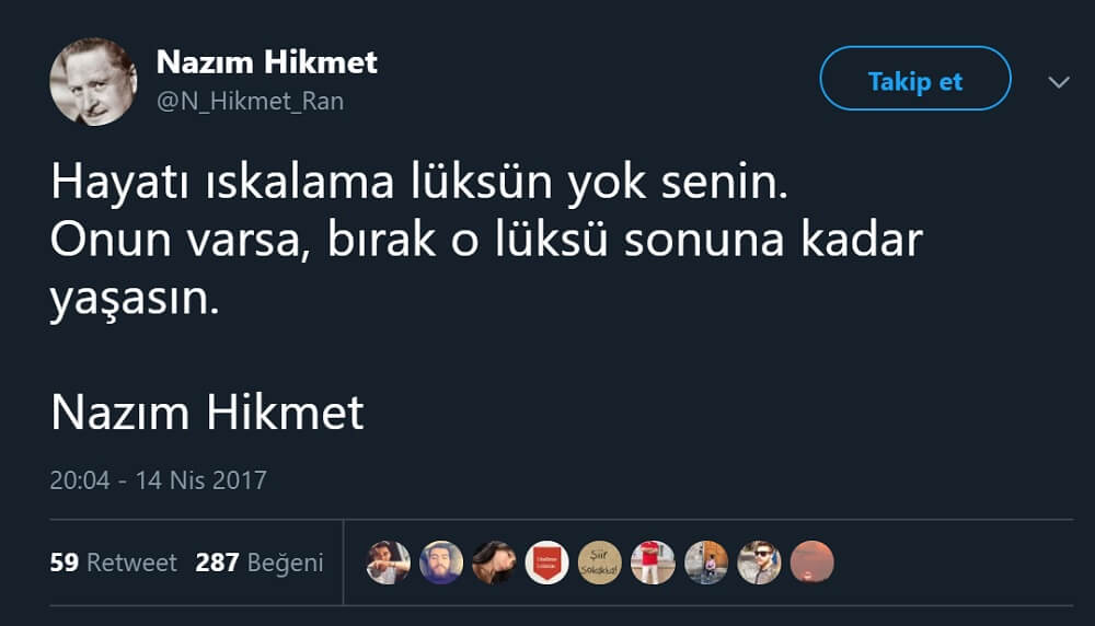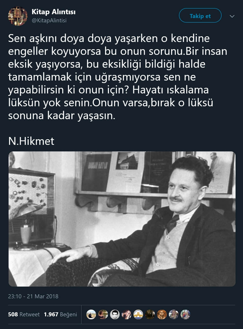 "Yaşanırken hiç bitmeyecek zannettiğimiz aşkımızın gün gelip de bir bittiğinde; arkasından hayatın hala anlamlı olduğunu anlatan Nazım Hikmet’in bir şiirini paylaşmak istedim bu gün sizlerle! HAYATI ISKALAMA LÜKSÜN YOK SENİN!"