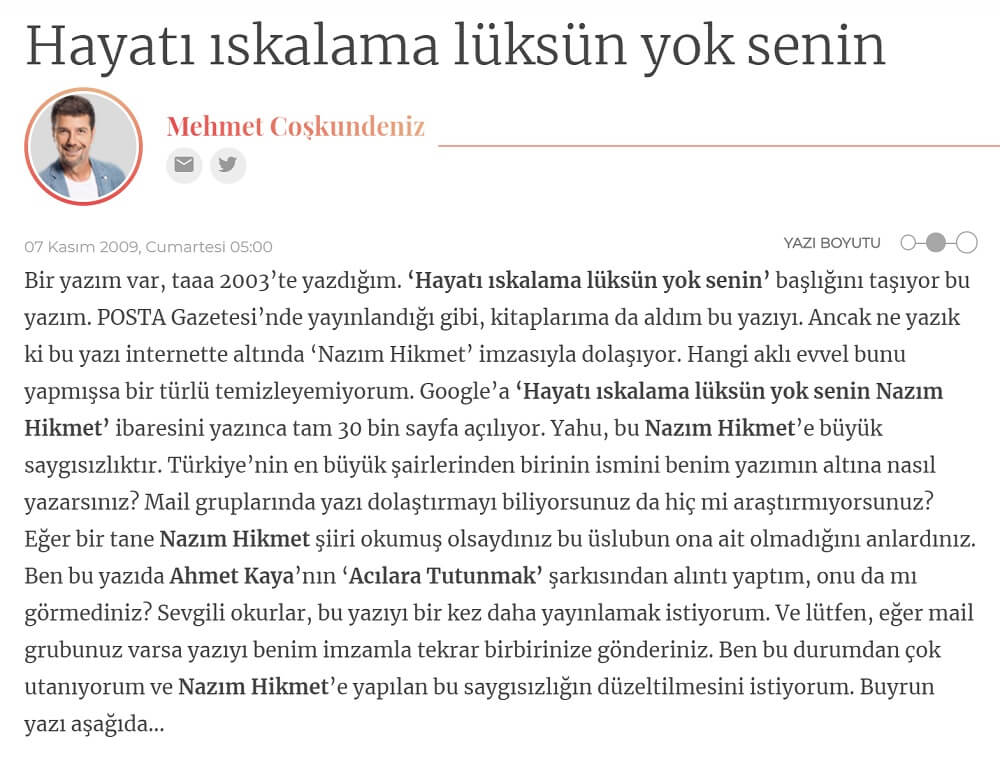“Bir yazım var, taaa 2003’te yazdığım. ‘Hayatı ıskalama lüksün yok senin’ başlığını taşıyor bu yazım. POSTA Gazetesi’nde yayınlandığı gibi, kitaplarıma da aldım bu yazıyı. Ancak ne yazık ki bu yazı internette altında ‘Nazım Hikmet’ imzasıyla dolaşıyor. Hangi aklı evvel bunu yapmışsa bir türlü temizleyemiyorum. Google’a ‘Hayatı ıskalama lüksün yok senin Nazım Hikmet’ ibaresini yazınca tam 30 bin sayfa açılıyor. Yahu, bu Nazım Hikmet’e büyük saygısızlıktır. Türkiye’nin en büyük şairlerinden birinin ismini benim yazımın altına nasıl yazarsınız? Mail gruplarında yazı dolaştırmayı biliyorsunuz da hiç mi araştırmıyorsunuz? Eğer bir tane Nazım Hikmet şiiri okumuş olsaydınız bu üslubun ona ait olmadığını anlardınız. Ben bu yazıda Ahmet Kaya’nın ‘Acılara Tutunmak’ şarkısından alıntı yaptım, onu da mı görmediniz?”