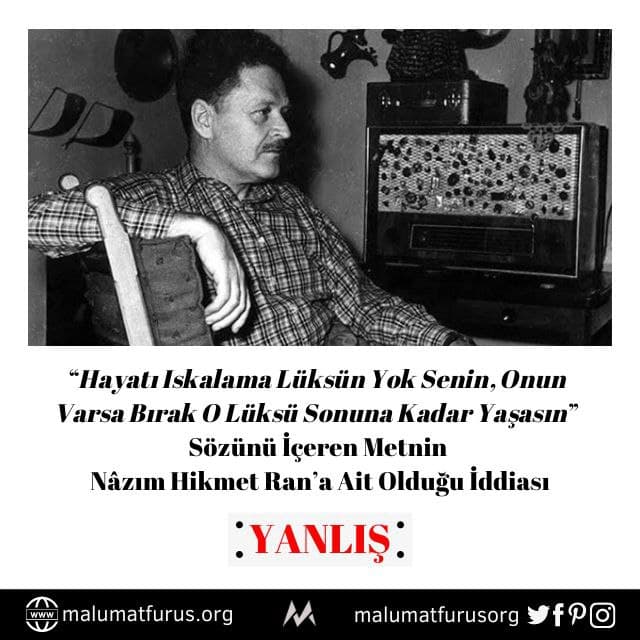 “Hayatı Iskalama Lüksün Yok Senin, Onun Varsa Bırak O Lüksü Sonuna Kadar Yaşasın” Sözünü İçeren Metnin Nâzım Hikmet’e Ait Olduğu İddiası Doğru Değil
