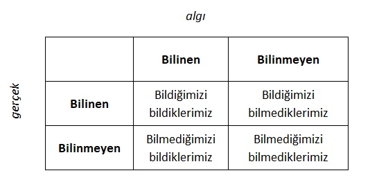“Bilinen / bilinmeyen” temalı matrisi şöyle Türkçeleştirebiliriz: