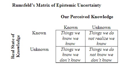 Sadece farkına varılabilen hususlar üzerinden sonuç çıkarmanın yanlışlığı konusunda akla gelen bir diğer husus da eski Amerika Birleşik Devletleri (ABD) Savunma Bakanı Donald Rumsfeld’in 12 Şubat 2002 tarihinde verdiği basın brifinginde, Irak’ın ABD ve koalisyon güçleri tarafından işgali öncesinde (bir türlü bulunamayan) kitle imha silahlarına sahip olduğu iddiasını desteklemek için kullandığı ifadeler.