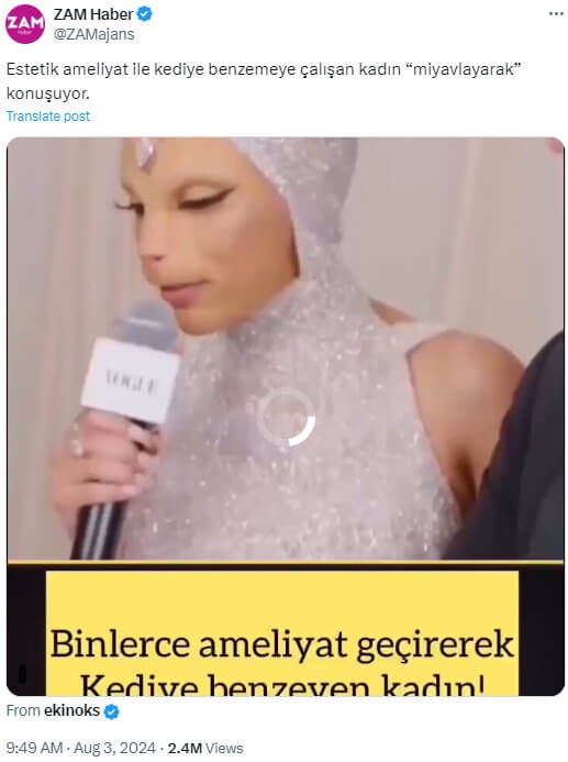 ZAM Haber (@ZAMajans): “Estetik ameliyat ile kediye benzemeye çalışan kadın “miyavlayarak” konuşuyor.”