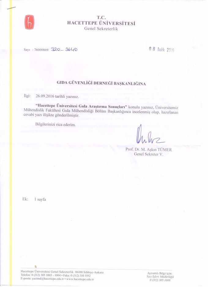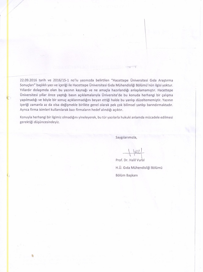 22.09.2016 tarih ve 2016/15-1 no’lu yazınızda beliritlen “Hacettepe Üniversitesi Gıda Araştırma Sonuçları” başlıklı yazı ve içeriği ile Hacettep Üniversitesi Gıda Mühendisliği Bölümü’nün ilgisi yoktur. Yıllardır dolaşımda olan bu yazının kaynağı ve ne amaçla hazırlandığı anlaşılamamaıştır. Hacettepe Üniversitesi yıllar önce yaptığı basın açıklamalarıyla Üniversite’de bu konuda herhangi bir çalışma yapılmadığı ve böyle bir sonuç açıklanmadığını beyan ettiği halde bu yanlışı düzeltememiştir. Yazının içeriği zamanla az da olsa değişmekle birlikte gneel olarak pek çok bilimsel yanlışı barındırmaktadır.