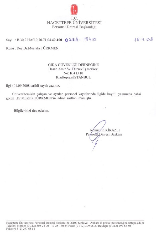 Ayrıca, Doç. Dr. Mustafa Türkmen adlı bir akademisyen Hacettepe Üniversitesinde çalışmamıştır. Hacettepe Üniversitesi, personel kayıtlarında Mustafa Türkmen adlı bir isme rastlayamadığını duyurmuştur.
