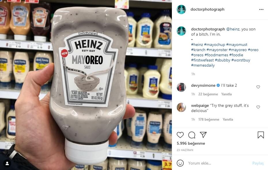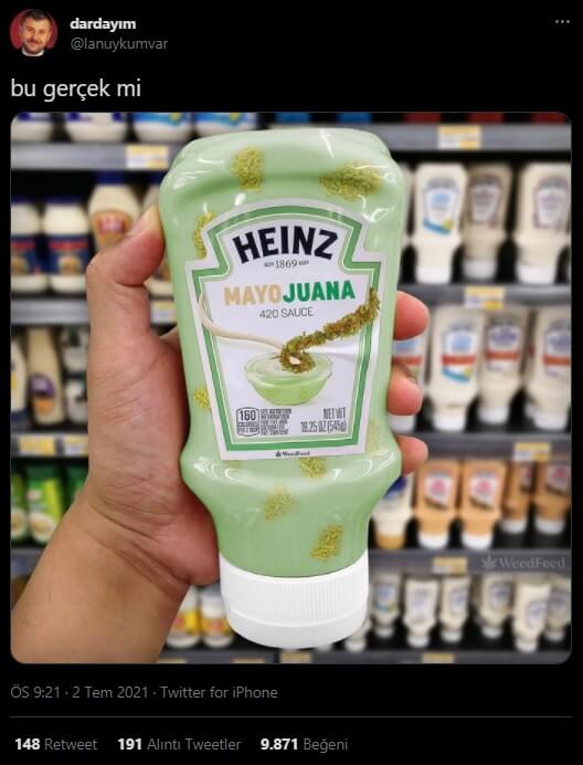 Heinz adlı sos markasının “Mayoreo” ya da “Mayojuana” adlı Oreolu ve Marihuanalı mayonez ile şeffaf ketçap (clear ketchup) ürün görselinin son dönemde sosyal medyada gerçek sanılarak paylaşıldığına şahit oluyoruz.