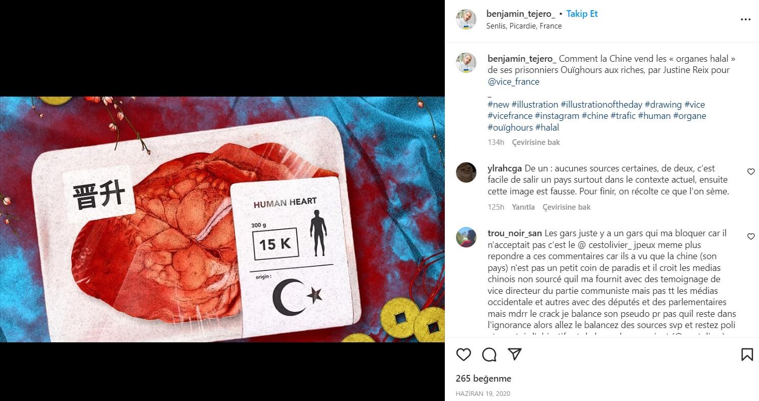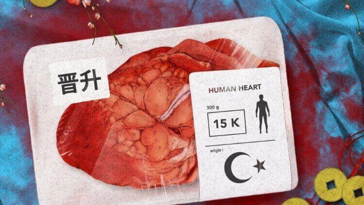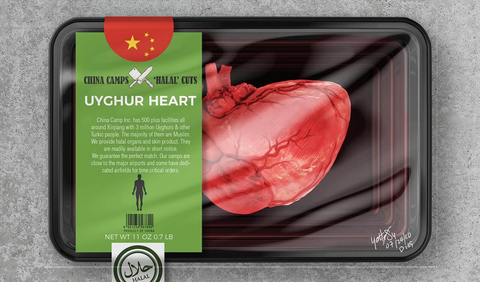 Üzerinde ay-yıldız ve Çince ibare barındıran paketlenmiş insan kalbi görseli Benjamin Tejero adlı sanatçı tarafından Vice’ın Uygurların organlarının satıldığına dair incelemesi için hazırlanmış.