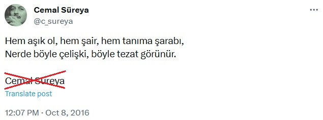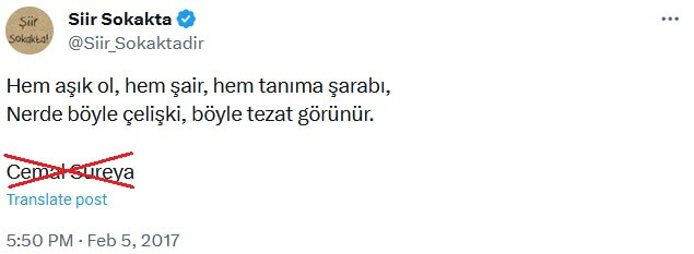 Yanlış atıf örneklerini taradığımızda karşımıza yine olağan şüpheliler çıkıyor: Cemal Süreya adına açılan hesap ve “Şiir Sokakta” adlı profil…
