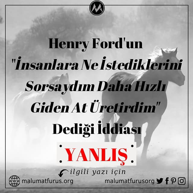 “İnsanlara ne istediklerini sorsaydım daha hızlı giden at üretirdim” vecizesinin Henry Ford’a ait olduğu iddiası doğru değil. Bu iddiayı destekleyecek sağlam bir kanıt bulunmamaktadır. 1947 yılında vefat eden Henry Ford’un bu sözü söylediğine dair ilk isnatların 2000’li yılların başında yapıldığı görülmektedir.