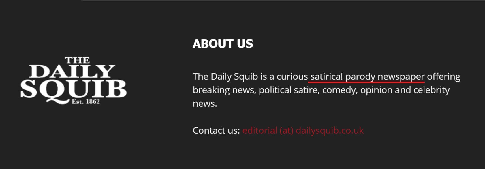 “Daily Squib, son dakika haberleri, siyasi hiciv, komedi, fikir ve ünlü haberleri sunan meraklı bir hiciv parodisi gazetesidir.“