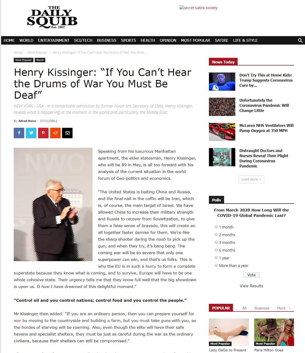 Henry Kissenger’a ait sanılan 3. Dünya Savaşı’nın yakın olduğuna dair sözler, The Daily Squib isimli hiciv içerikli haberler yapan sitede 2011 yılında, “Eğer savaş tamtamlarını duyamıyorsanız, sağır olmalısınız” (Henry Kissinger: “If You Can’t Hear the Drums of War You Must Be Deaf”) başlığıyla yayınlanan ve gerçeği yansıtmayan sahte röportaja ait. The Daily Squib, Zaytung benzeri parodi – hiciv içerikli asılsız metinler paylaşan bir site.
