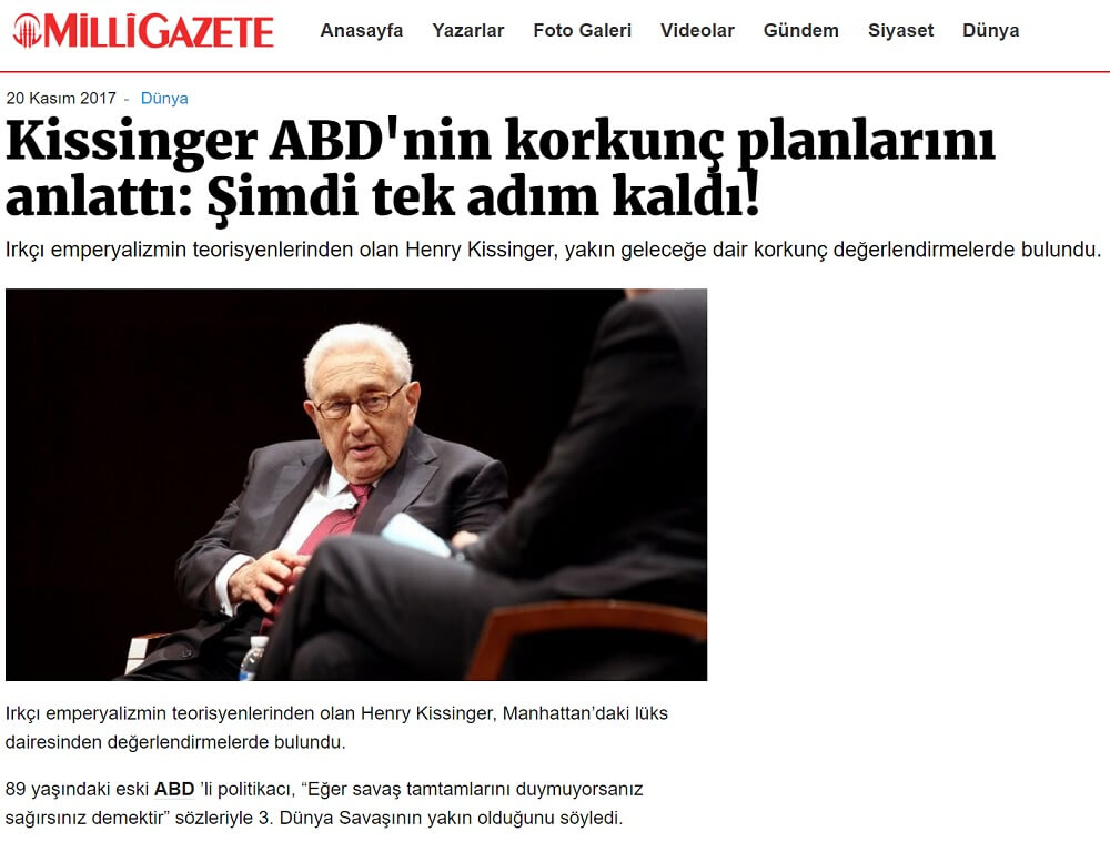 Milli Gazete’nin 2017 yılında “Kissinger ABD’nin korkunç planlarını anlattı: Şimdi tek adım kaldı!” başlığıyla yayınladığı (ve sonradan yayından çektiği) haberi durduk yere 2020 yılı Nisan ayında tekrar “Henry Kissinger: 3. Dünya savaşı geliyor, Müslümanlar toz olacak!” başlığıyla yayınlayınca bu iddianın doğrusunu aktaralım istedik (Yeni Akit.