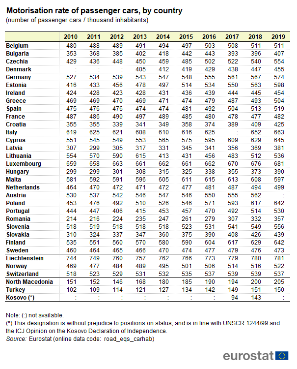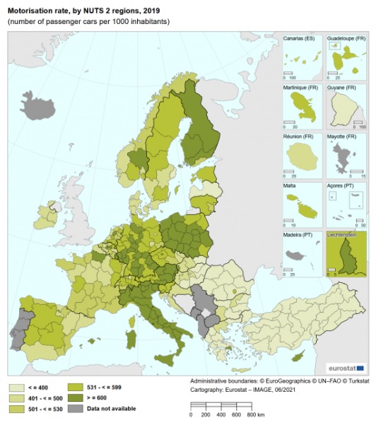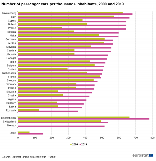 2020 yılı itibarıyla AB genelinde ortalama 560 olan 1000 kişiye düşen otomobil sayısı Lihtenştayn’da 779 iken, Türkiye’de 157’ydi.