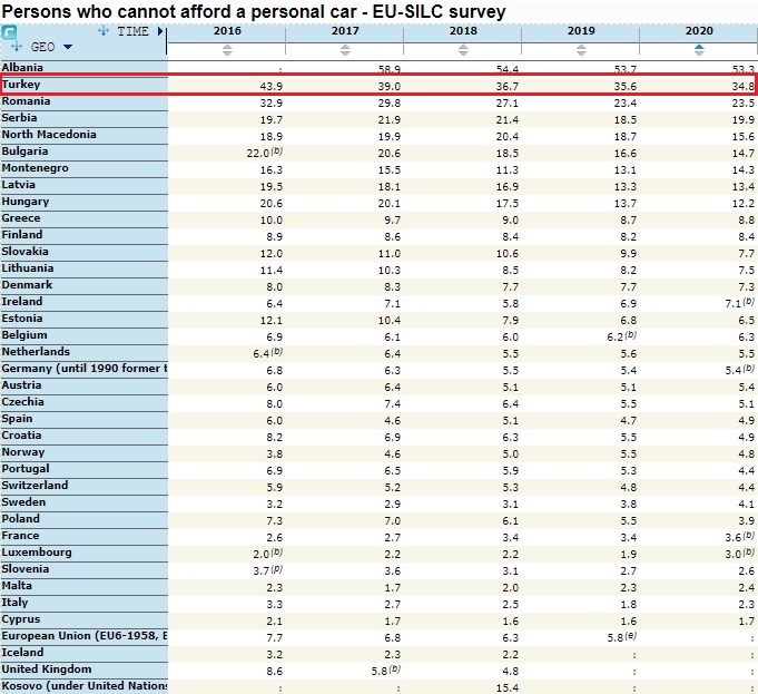 Eurostat‘ın hazırladığı verilere göre Türkiye’de halkın % 35’i otomobil satın alma imkânının olmadığını belirtiyor. Bu veride Türkiye Avrupa’da 2. sırada bulunuyor.